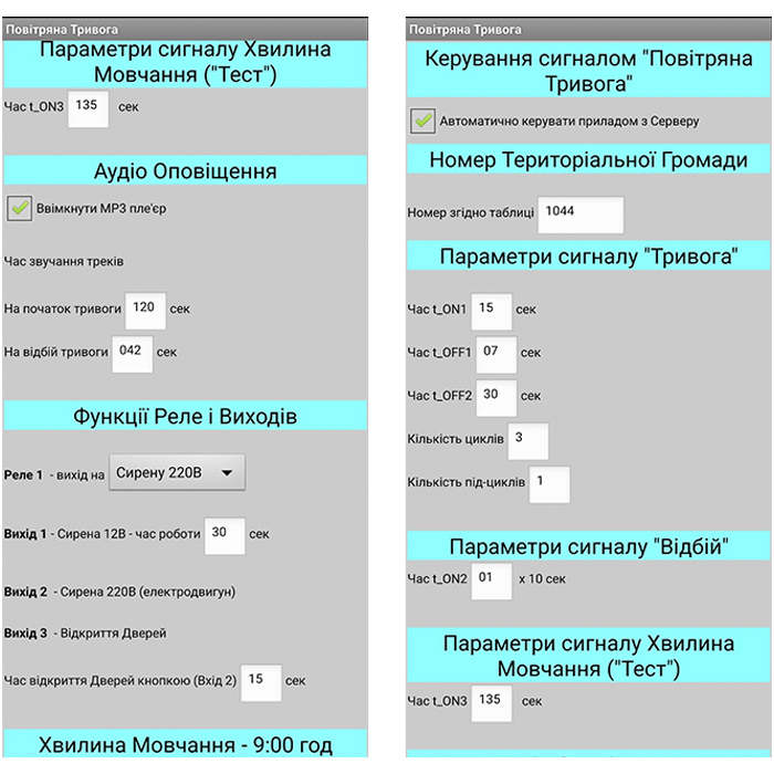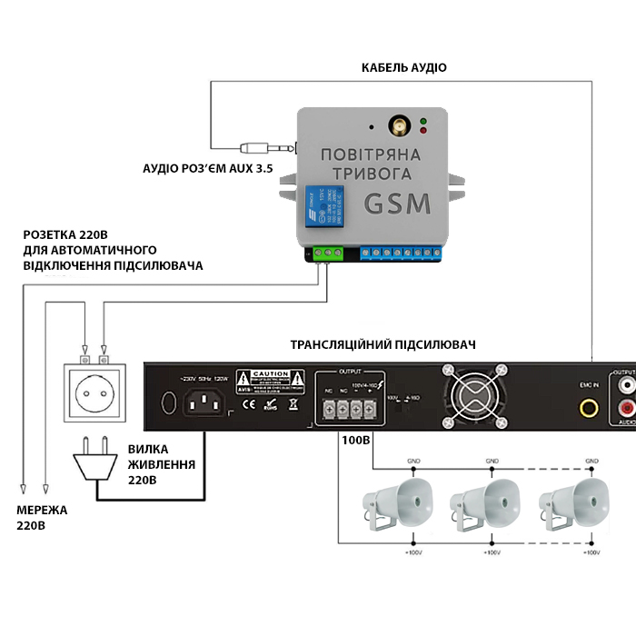 - Відтворення: Через аудіовихід (Jack 3.5 мм) подається сигнал на підсилювач. Відтворюється стандартний звук сирени або заздалегідь записане голосове повідомлення («Увага! Повітряна тривога!»).