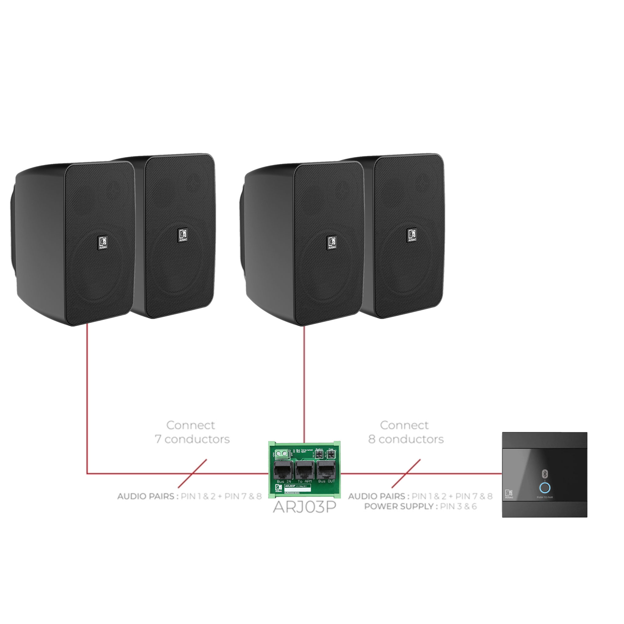 AUDAC WP220/W – встраиваемая настенная панель Bluetooth-приемника для удаленного подключения источника звука с целью трансляции музыки через различные аудио устройства производства AUDAC: акустические системы ARES5A, серия аудиоматриц MTX, микшер-усилитель AMP523, микшеры-предусилители линейки PRE и другие. Максимальное расстояние устройств от панели составляет 500 метров. Подключение указанных приборов производится за счет 8-pin Euroblock. Если требуется подсоединится к линейному аналоговому аудиовходу (например к PRExxx), то нужно применять дополнительный источник питания.