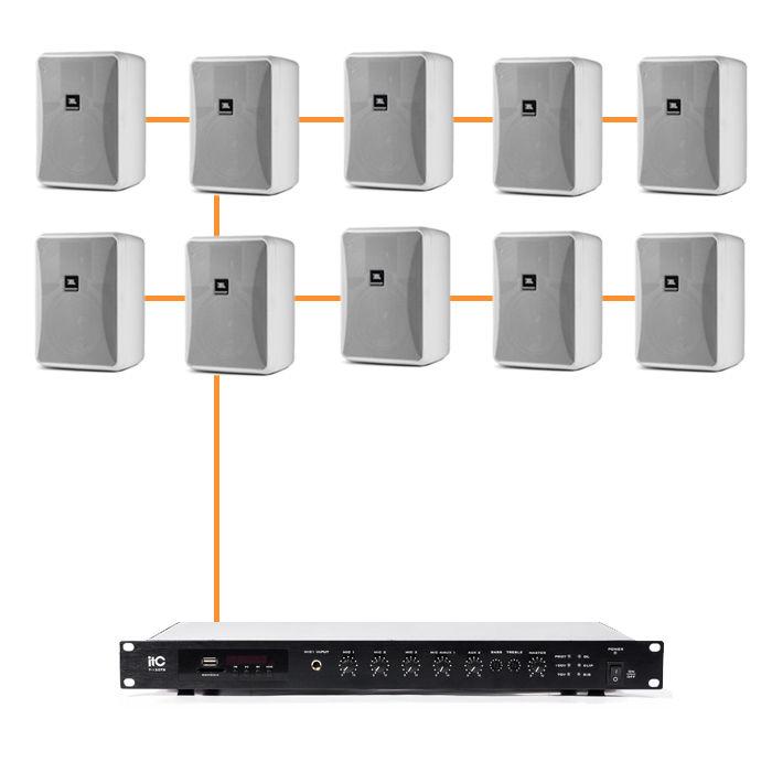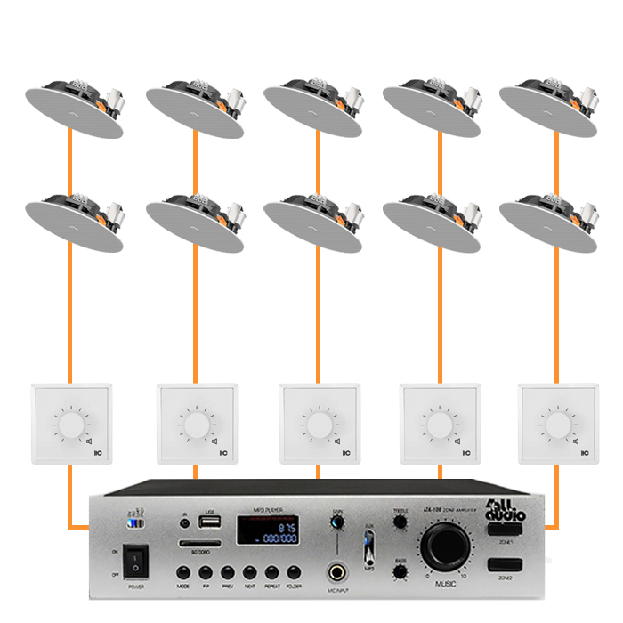 Для разных по площади помещений система подбирается индивидуально. В пространствах до 30 м² достаточно двух настенных или потолочных динамиков с покрытием 4–5 метров каждый. Помещения от 50 до 100 м² требуют 4–8 колонок в зависимости от конфигурации и загруженности пространства. В бизнес-зонах на 200 м² уже проектируются зонированные системы с 10–14 динамиками, распределёнными по группам, подключёнными к отдельным регуляторам громкости или централизованным усилителям. В крупных объектах от 300 до 500 м² используется до 30 динамиков с полным делением по зонам, возможностью удалённого управления, автоматическим переключением сценариев воспроизведения и подключением к системам эвакуационного оповещения.